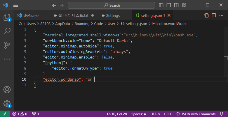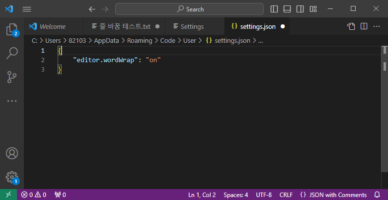 중괄호 블럭('{', '}') 안에 "editor.wordWrap" : "on" 작성 (다른 설정을 넣을 시 뒤에 쉼표를 꼭 기입)