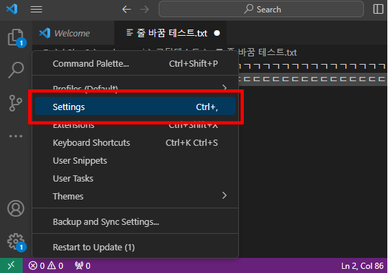 좌측 하단의 톱니바퀴 클릭(또는, Ctrl + , )